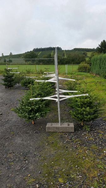 Hierbei handelt es sich um zwei flexible, miteinander verbundene Leisten die am hinteren Ende dank zweier Haken am Bauzaun eingehängt werden. Im vorderen Bereich wird der Baumstamm in beliebiger Höhe eingeklemmt - so steht der Baum gerade und kann perfekt präsentiert und von allen Seiten begutachtet werden.